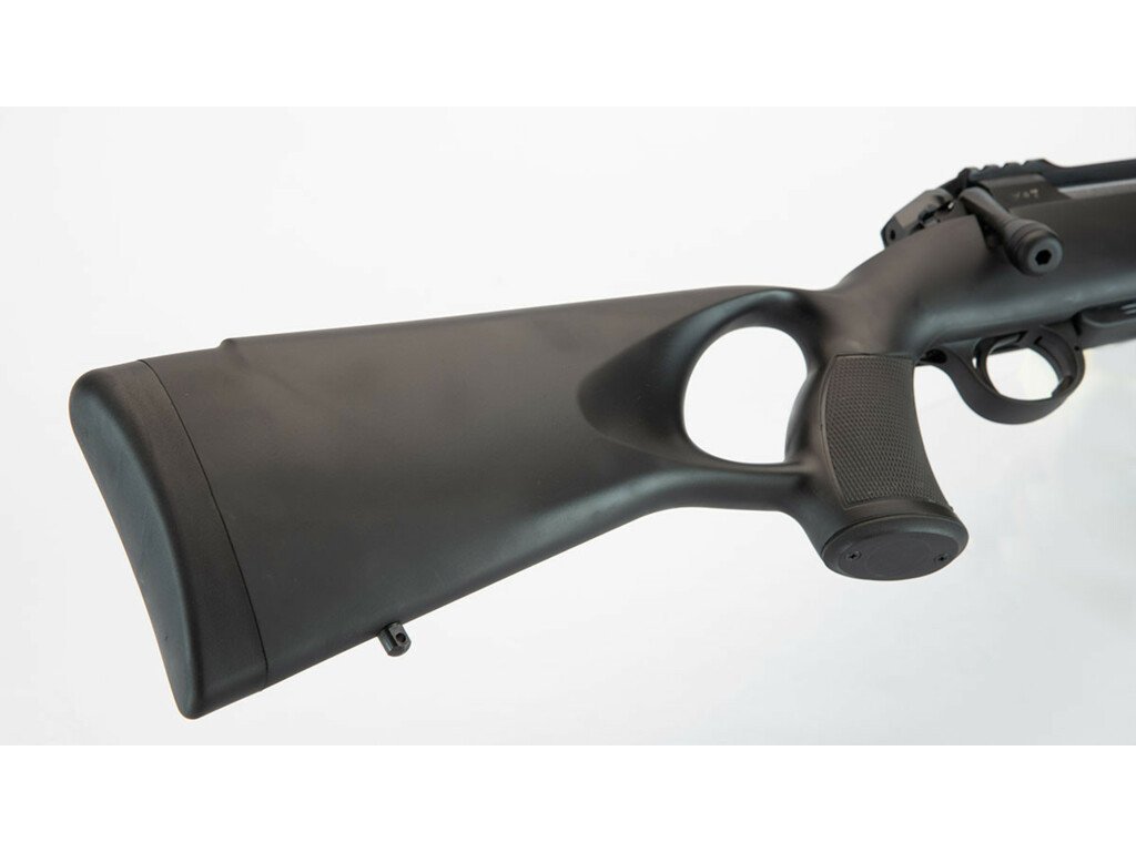 Černá polymerová thumbhole pažba s téměř vertikální anatomickou rukojetí poskytuje střelci maximální kontrolu nad zbraní při každém výstřelu. Kombinuje nízkou hmotnost s výbornou stabilitou a komfortem. Měkká botka účinně tlumí zpětný ráz i u silnějších ráží. Spoušť lze zvolit s napínáčkem nebo bez, dle individuálních preferencí střelce. Díky vynikajícímu poměru ceny a výkonu patří Sabatti Rover Thumbhole ke špičce ve své třídě.