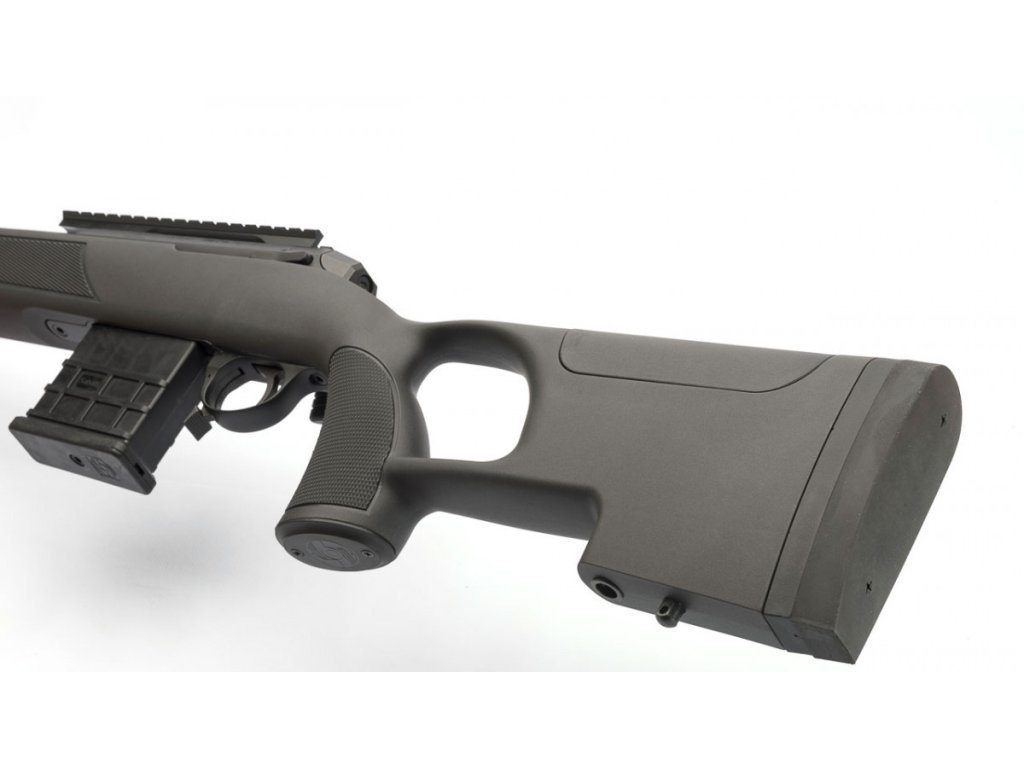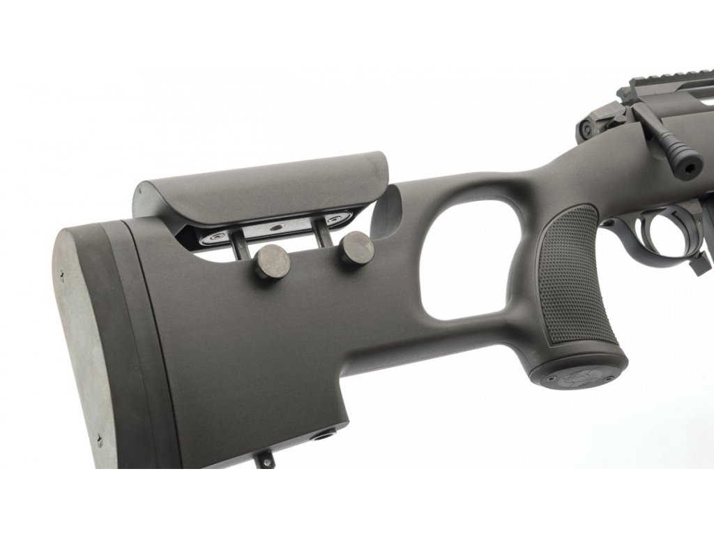 Černá polymerová thumbhole pažba je vybavena plně stavitelnou lícnicí, která umožňuje dokonalé přizpůsobení střelci. Taktická klička závěru usnadňuje rychlé a plynulé přebíjení. Zásobník s kapacitou až 10 nábojů podtrhuje sportovní charakter zbraně. Urban Sniper kombinuje ergonomii, stabilitu a moderní technologie, které ocení každý přesný střelec.
